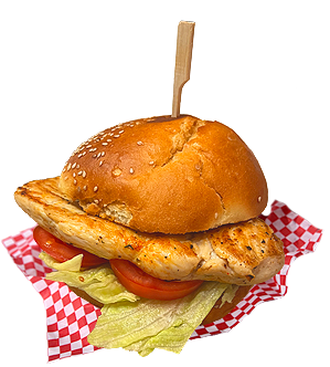Naše bulka, salát, rajče, grilované kuřecí prso, česneková majonéza + hranolky.